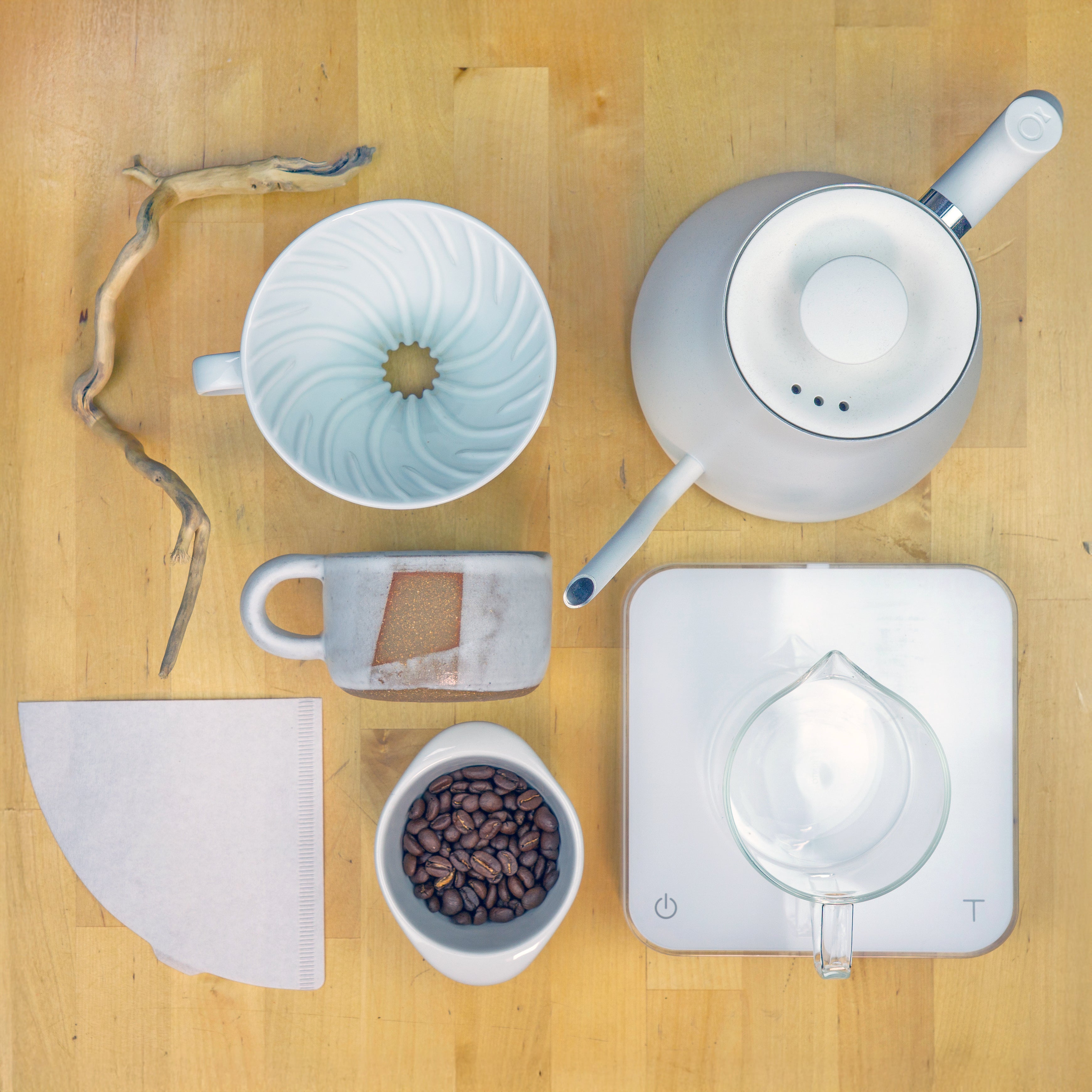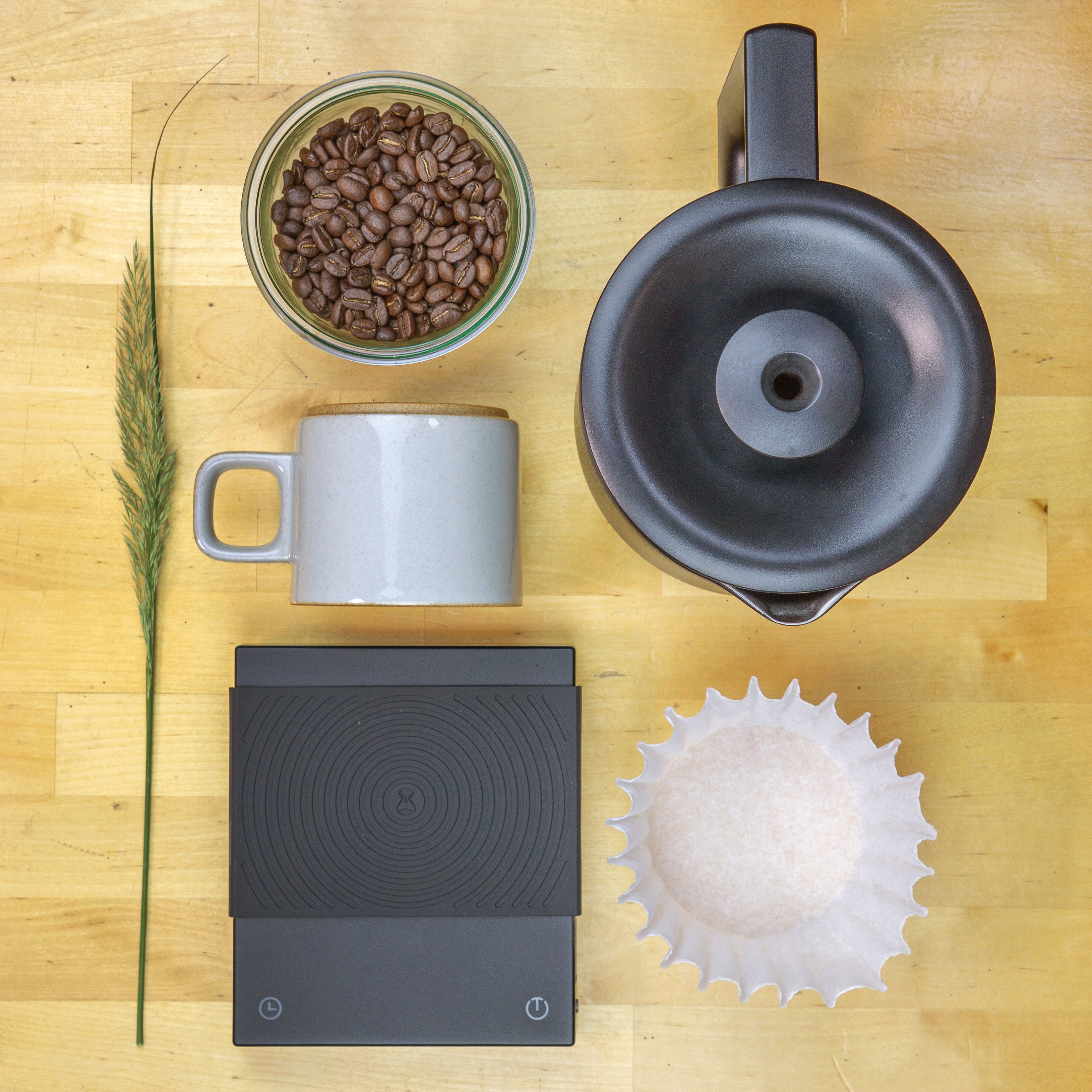a. slightly finer for V60 or cone shaped drippers, slightly coarser for Kalita or flat-bottom drippers - Add coffee to your brewer, settle the bed, tare your scale, and start the timer.
