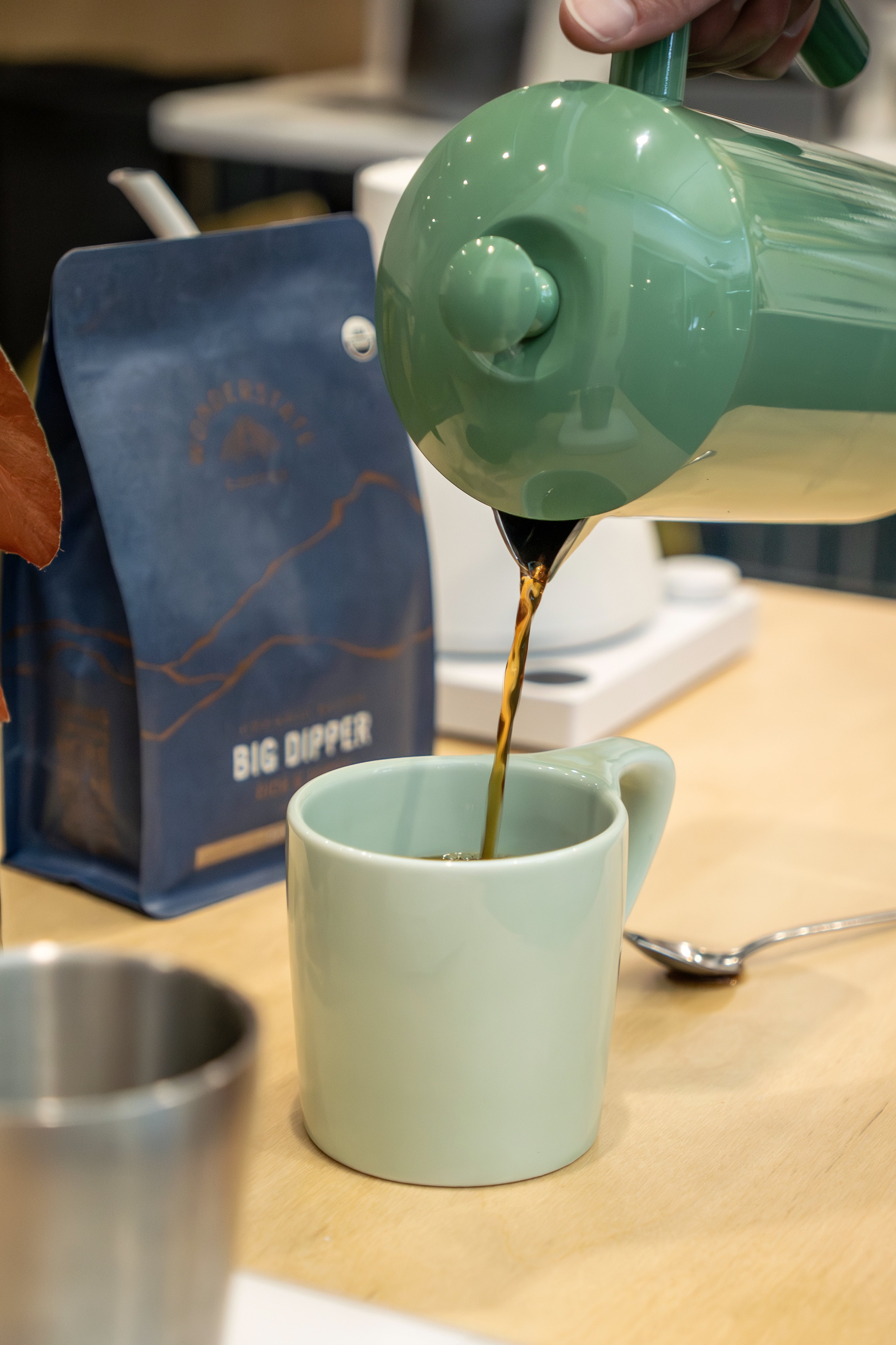 - Before pressing, use two spoons to break the crust and skim off foam and loose grounds.